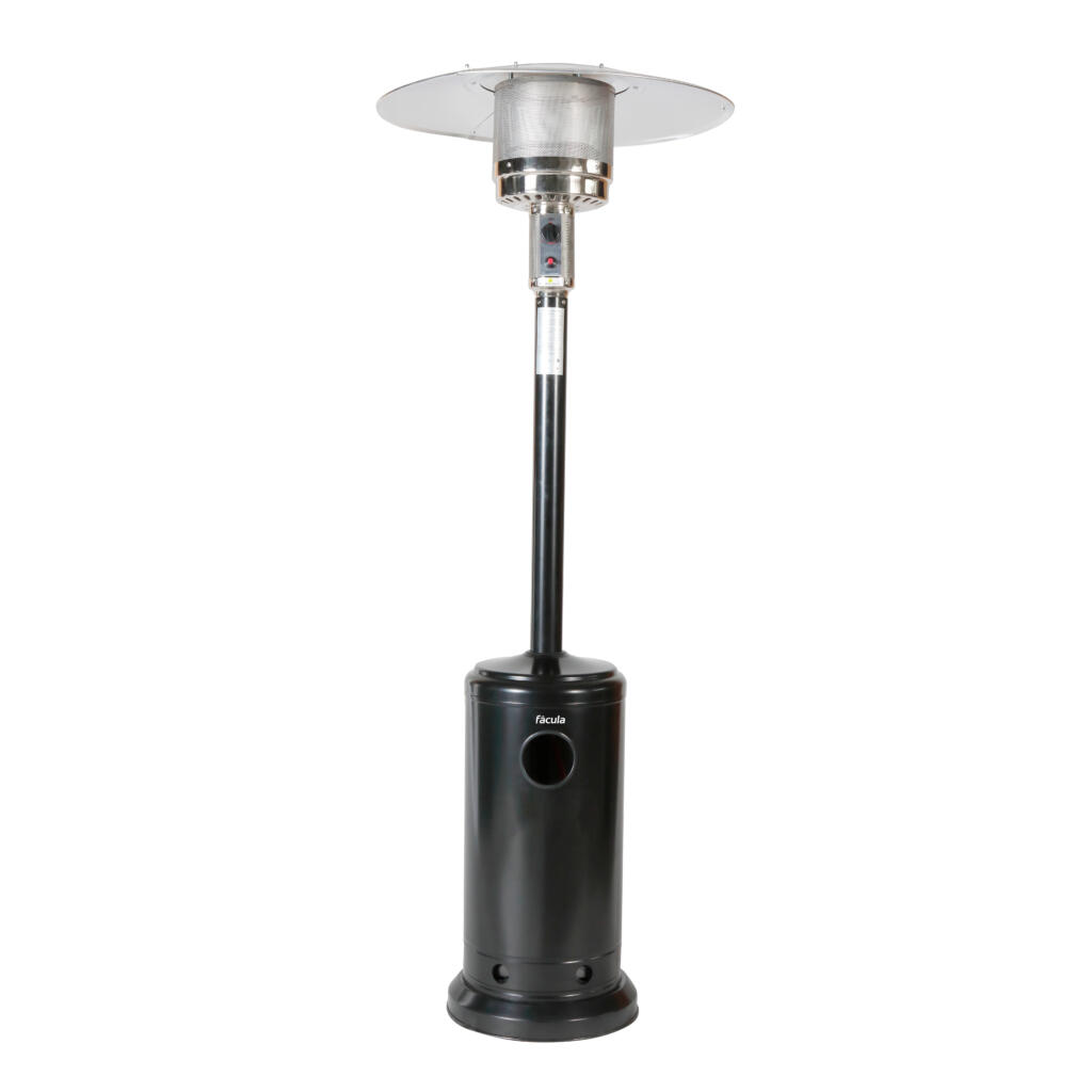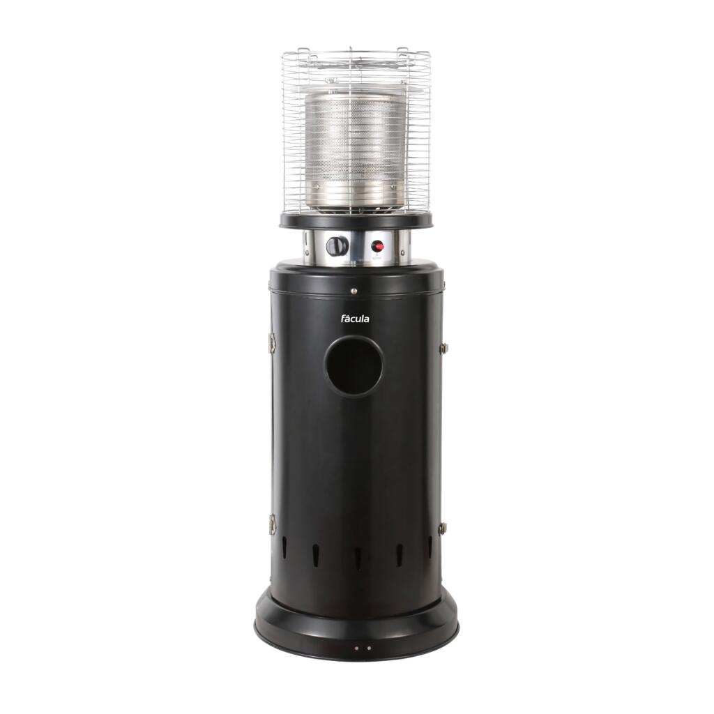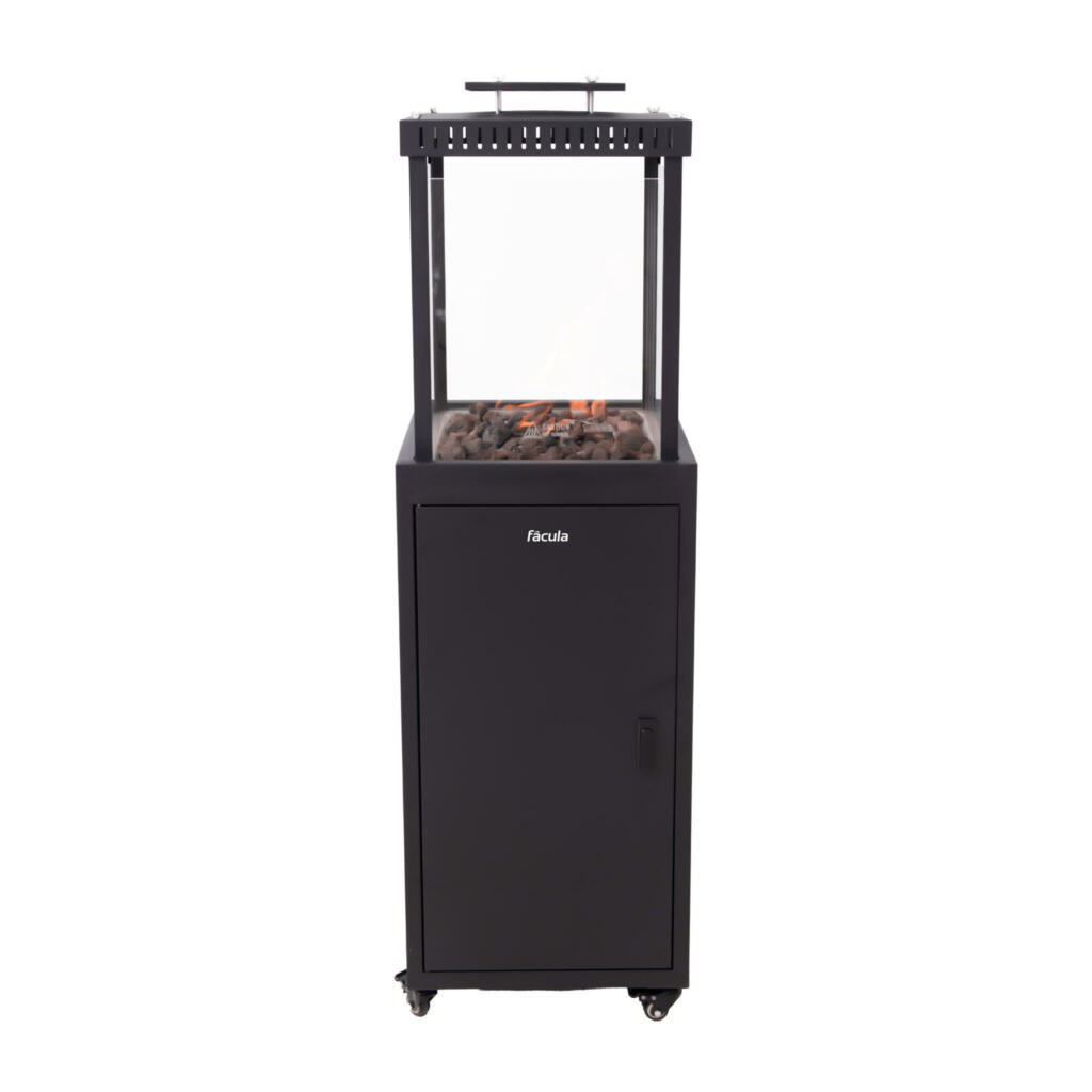 Estufa de gas exterior negra de 9kW con piedra volcánica.
