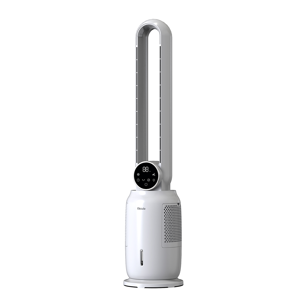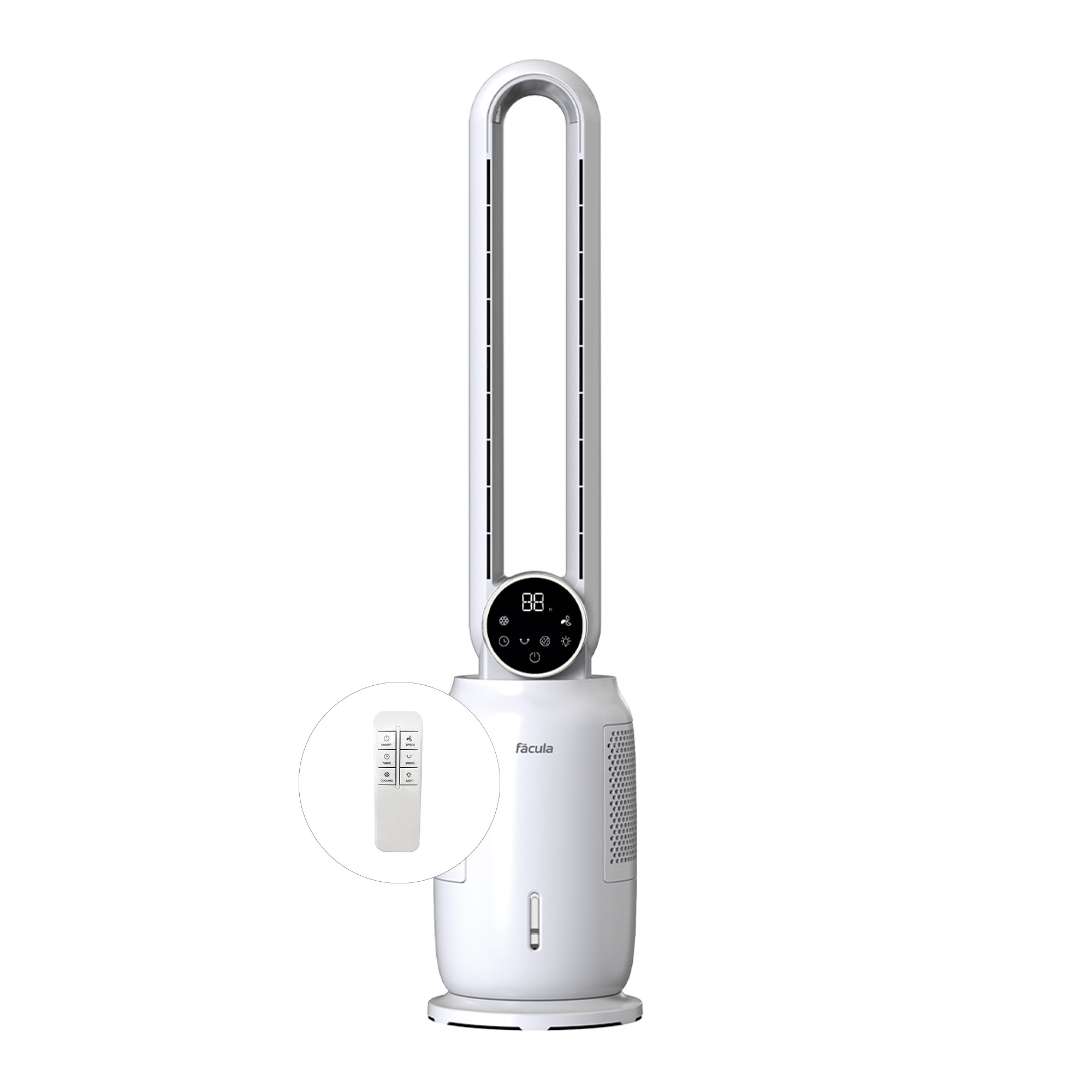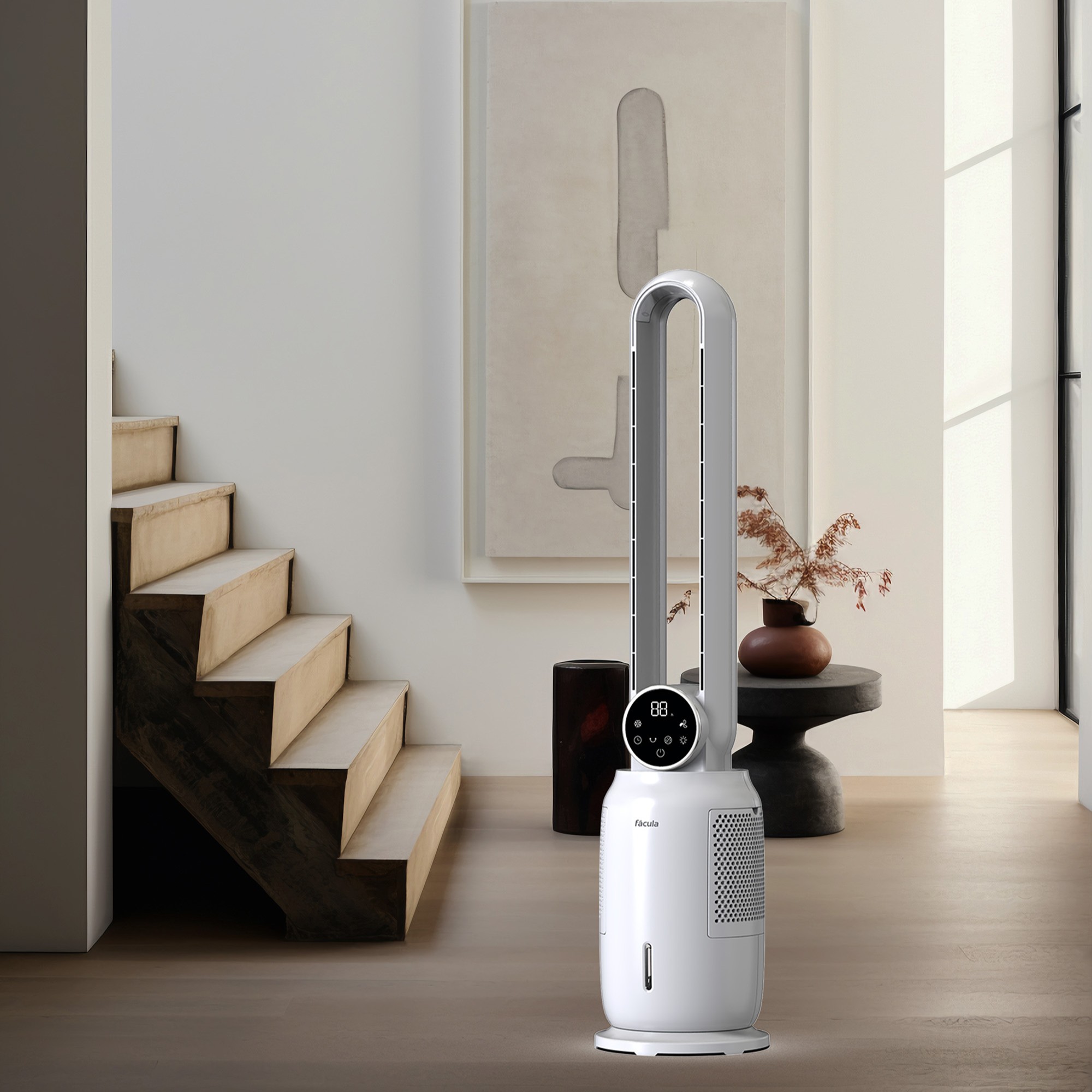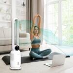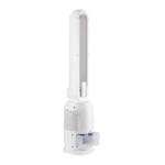 Pantalla digital, oscilación 45º, temporizador 12 h, visualización de temperatura, nivel de agua visible, motor DC silencioso, mando a distancia, 60 dB máx.