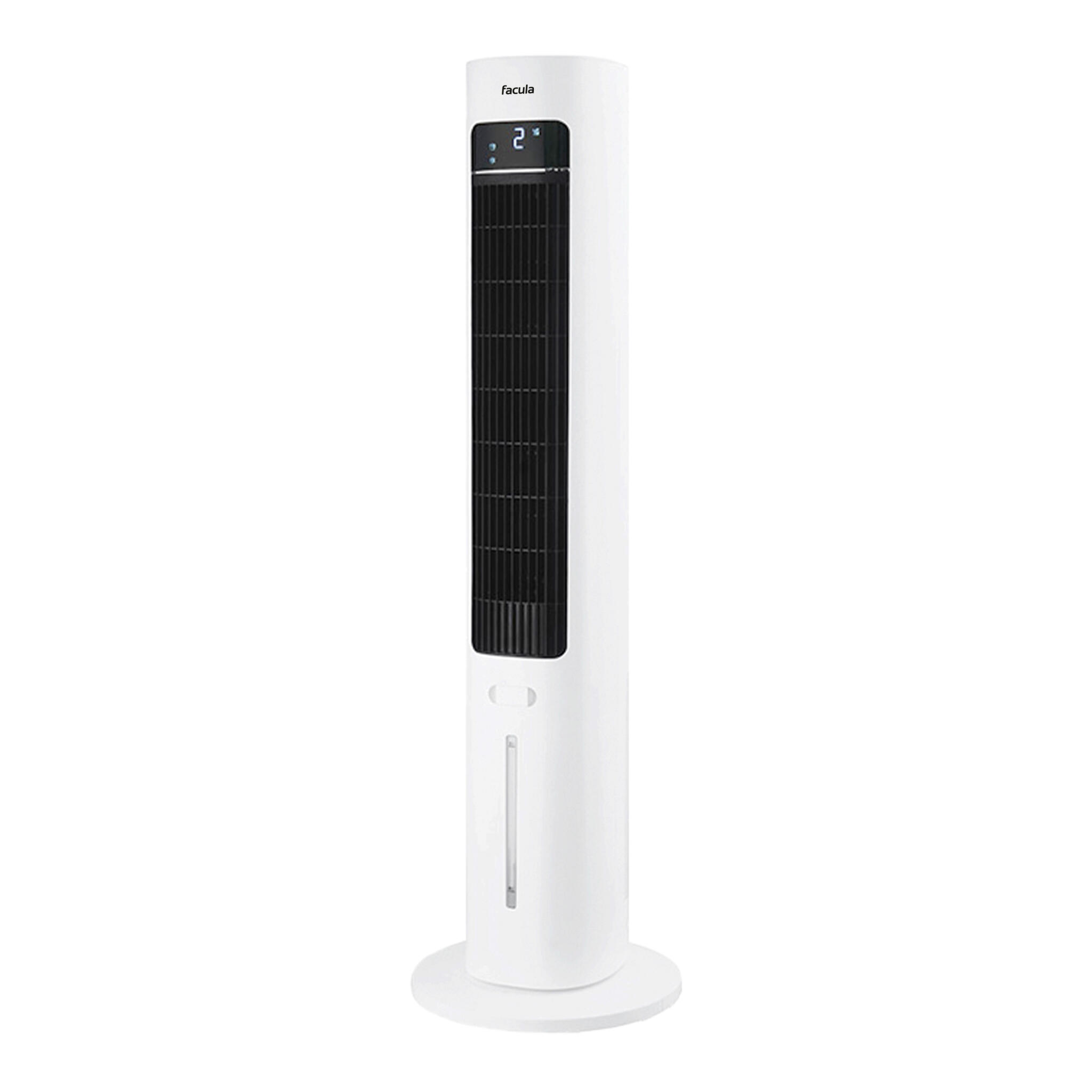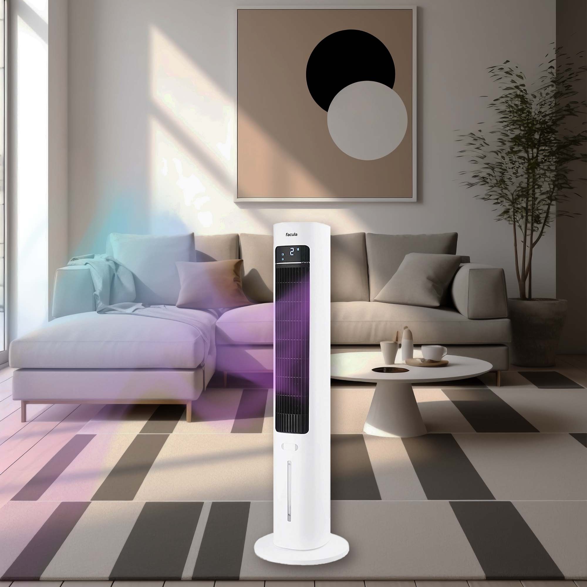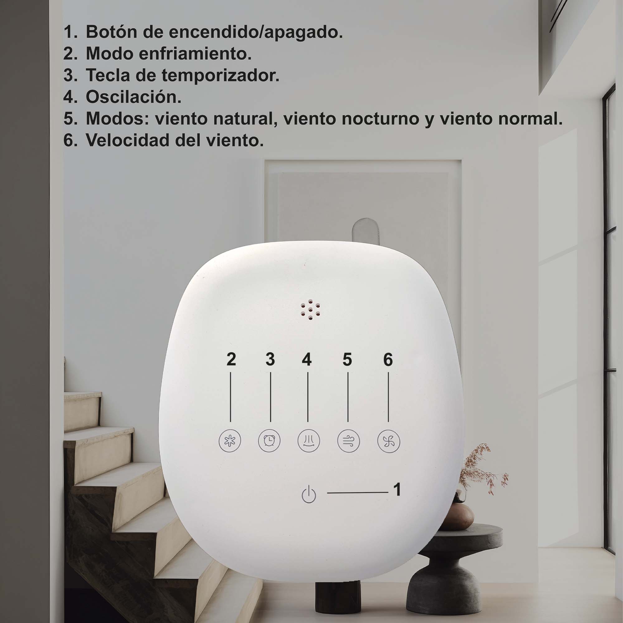 Con 60W, 3 velocidades, función oscilación, pantalla táctil, mando a distancia y temporizador 12h. Depósito de agua de 3L y asa de transporte.
